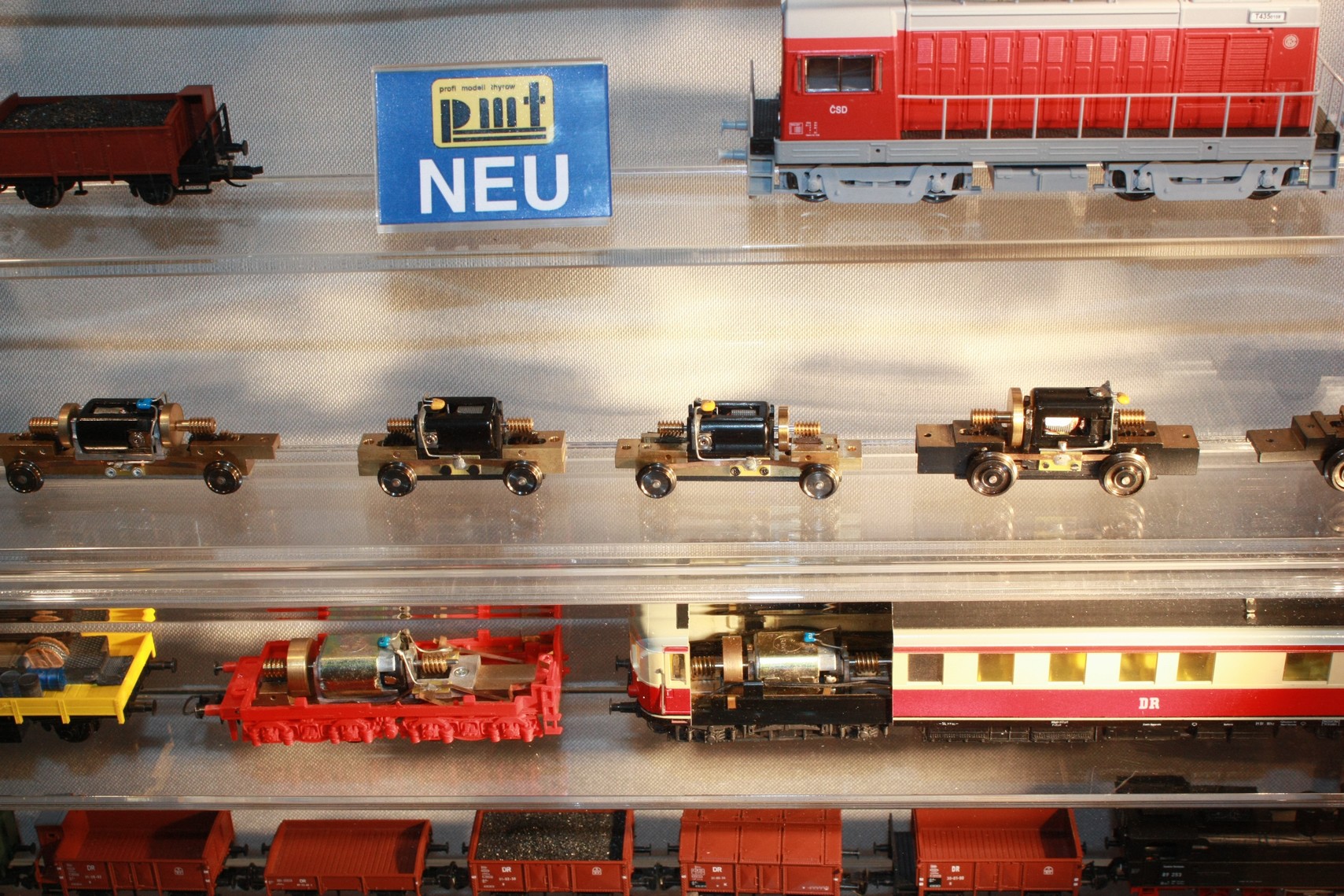 Modelová železnice, modely lokomotiv, vagónů a mašinky firmy PMT: