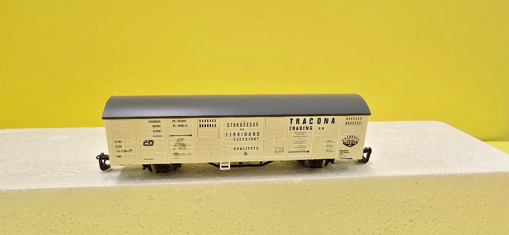 Krytý nákladní vůz drah ČD a to bílé barvy, s nápisem"Tracona", kulisa na krátké spřáhlo, Délka: 117 mm.