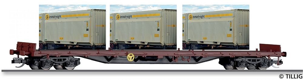 18137 Tillig TT Bahn - Plošinový vůz s klanicemi ložený kontejnery na dřevní štěpku "WoodTainer XXL"