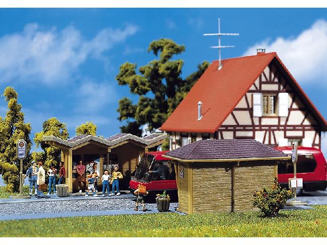 Autobusová zastávka, dřevěná stavba. Použitelné na malé město a nebo vesnice. 2 kusy rozměry: 72x26x37mm 61x32x37mm