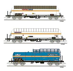 3-dílný set cisternových vozů, 2x cisterna pro přepravu plynu "TOTALGAZ","NACCO", 1x cisterna "Wascosa"