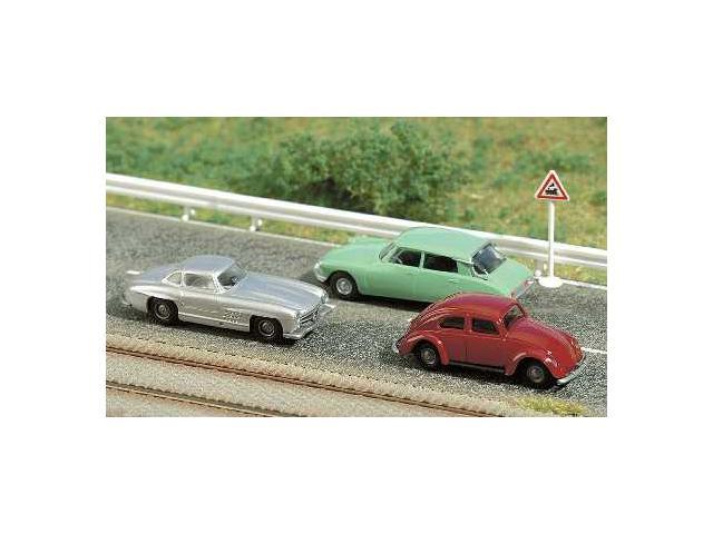 3 osobní auta - 50 léta Sada obsahuje: VW brouk (rok výroby 1951) Mercedes 300 SL (rok výroby 1954) Citroen DS 19 (roků výroby 1955) se svodidlem a dopravní značkou