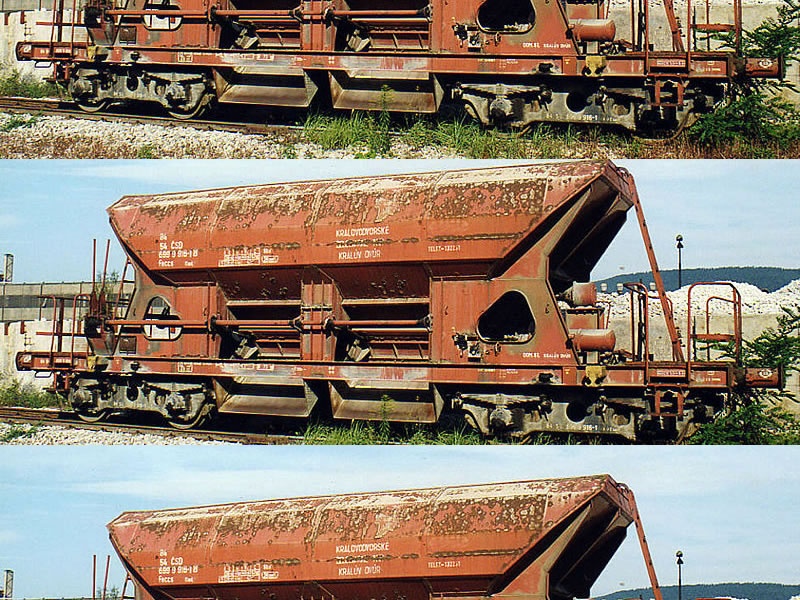 Set tří vozů Faccs/Sas ČSD Královodvorské železárny n.p., SET B. Každý vůz má jiné inventární číslo.