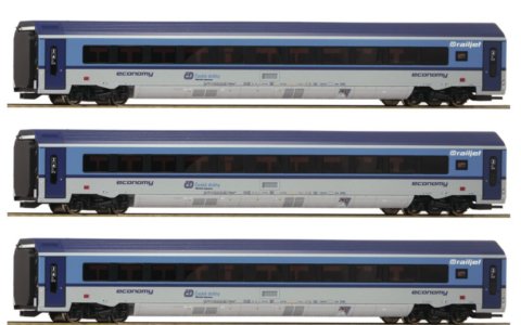 Informace k 74068 Roco - 3- dílný set rychlíkových vozů "RailJet" s funkčním DCC dekodérem (2x economy, 1x 1.tří