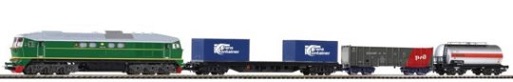 97921 PIKO - Start set s dieselovou lokomotivou BR 130 a 3 nákladními vozy, ovál kolejí s výhybkou a trafo