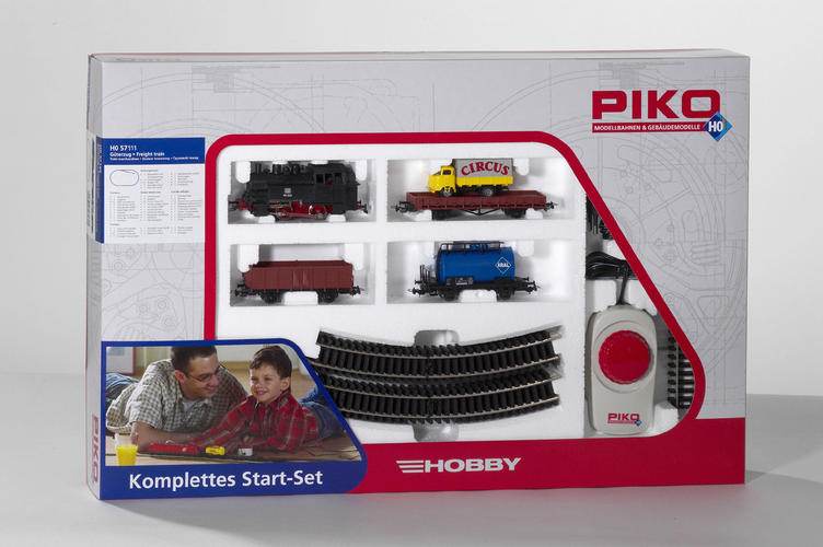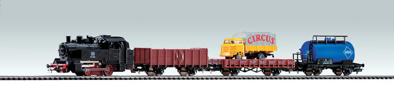 Obsah balení: 1 x parní lokomotiva 1 x otevřený nákladní vágon 1 x plošinový vagón naložený kamionem 1 x dvouosý cisternový vagón ovál kolejí velikost:110x88 cm