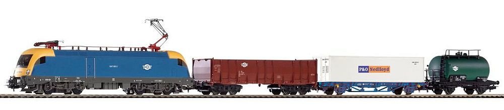 Analogový start set s elektrickou lokomotivou Taurus a třemi nákladními vozy + trafo a ovál kolejí s výhybkou a zarážedlem (HO)