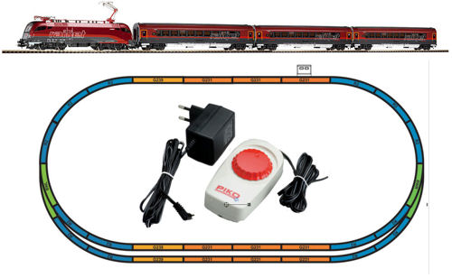 57172 PIKO - Analogový startset Railjet obsahující elektrickou lokomotivu Taurus + 3 osobní vozy, 14 x oblouková kolej, 12 x rovná kolej, 2 oblouk. výhybka, trafo + napájení