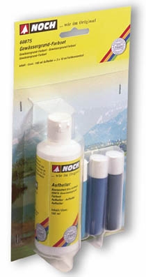 Sada barev na vytváření dna vodních ploch a toků. Obsah: 100 ml neutrální akrylátové barvy 3 barevné koncentráty: modrý, hnědý a zelený každý á 10 ml. Postup: Transparentně vysychající akrylová barva se smíchá s odpovídajícím množstvím barevných koncentrátů až je dosaženo odpovídajícího barevného tonu.Následně nanesete barvu štětečkem na plochu . Mimochodem: tento set je ideální v kombinaci s Noch vodní granulát a s Noch 2K vodní gel.