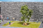 Model břízy o výšce 11,5 cm s kruhovou lavicí, která je postavena kolem stromu.