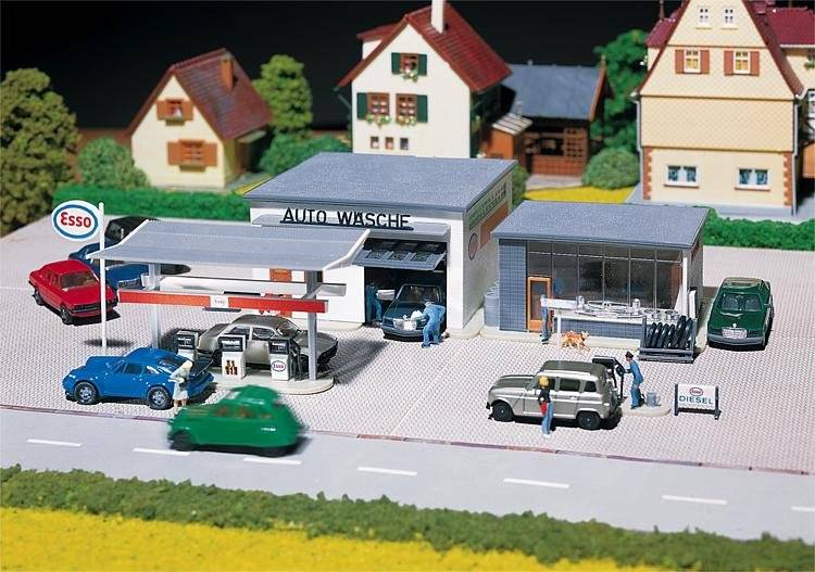Stavebnice modelu čerpací stanice s mycí linkou. Sada obsahuje tři budovy: čerpací stanici - 100 x 95 x 49 mm mycí linku - 85 x 65 x 39 mm tankovací sloupky - 84 x 45 x 50 mm