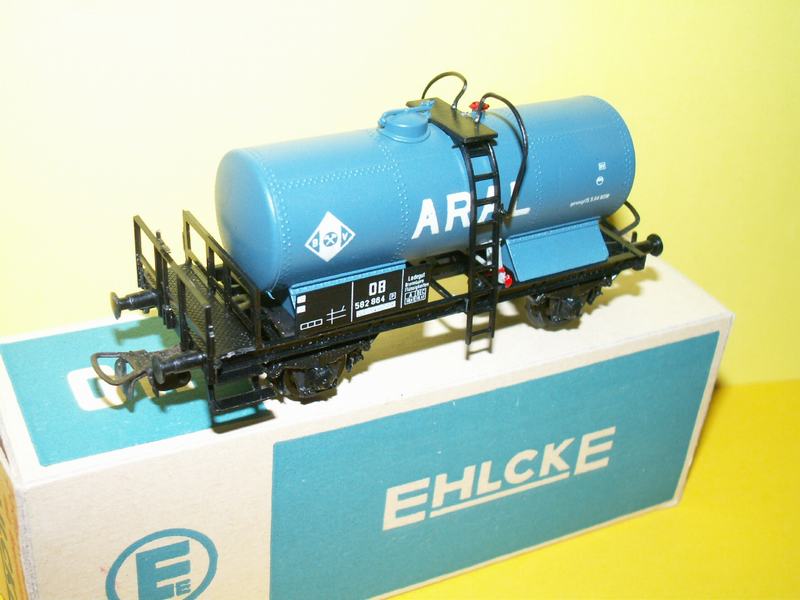 Uzavřený nákladní cisternový vůz modré barvy pod názvem ARAL drah německých