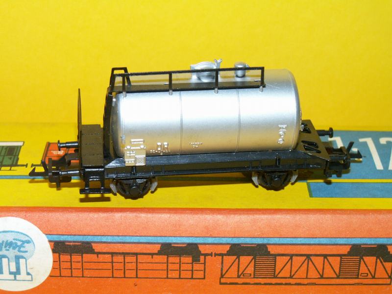cisternový nákaldní vůz stříbrné barvy a to s šedou brzdovou soutavou se všemi brzdovými špalíky, vůz má kovové zábralí a původní krabičku vše je neporušené. Výrobce:Zeuke TT Bahn 60.léta 20. století. Stav.nové