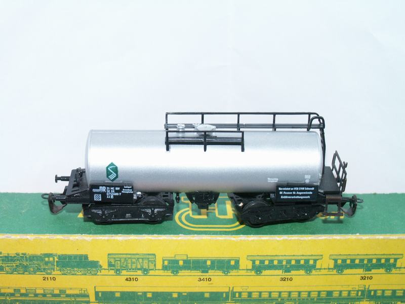Cisternový nákladní vůz 4 osý stříbrné barvy drah německých, má krabičku, zábradlí neporušeno. Stav: nové