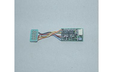 Rychlý přehled Dekodér - multi se zátěžovou regulací s konektorem pro zvukový modul parní loko - PI56190 s konektorem pro zvukový modul diesel - PI56191 Vlastnosti: zátěžová regulace na stejnosměrný proud - i pro pohyb motoru, řízení motoru přes 18,75 kHz ( nová Motorola a starý formát DCC) všechny provozy 14,28, 128 stupeň jízdy, lze si zvolit délku adresy ( minimálně, maximálně a nebo střední rychlost ), hlavní kolejové programy nově programovatelné přes Motorola a DCC a nebo centrálu ( automaticky rozpozná režim ), osvětlení závislé na směru jízdy, otáčivý rozměr přes "F O", režim posunu a rozsah rozjezdu, brzdové zpomalení přes "F 3" / "F4", ochrana proti přehřátí a ochrana před strátou tachnických dat: Celkové zatížení : 1A Motorové výstupy: 1 A Motorola jízdní stupeň 14 směr jízdy. Světelná rychlost : 2 zátěže Výpadek funkce: 2 velké ( 12,5x22x5 mm).