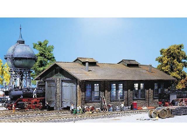 Depo 1-stání Cihlová stavba, s 2x přístřešek na lokomotivu do 270 mm. Vhodné i pro trolejový provoz. Otevření a zavření brány je automatické. Vzdálenost os kolejí: 8,0 cm Rozměry: 36,5x19,5x13,0 cm Vhodné figurky č.151000, 151017.