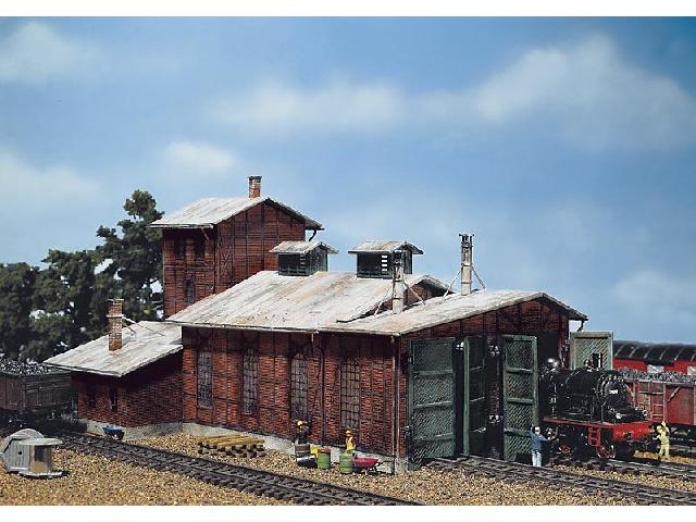 Depo 2-stání S 2x přístřešky na lokomotivu do 190mm. Otevření a zavření brány je automatické. Výška brány: 6,5 cm Vzdálenost os kolejí: 6,3 cm Rozměry: 30,5x16,4x13,8 cm Vhodné figurky č.151000, 151017.