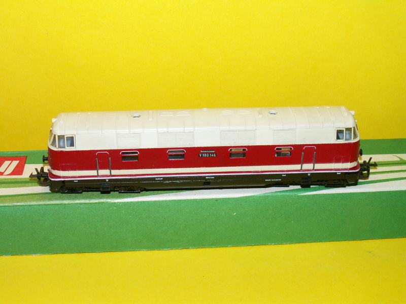 4 osá dieselová lokomotiva červenobílé barvy drah německých, řady BR 180 146 model má naháněny všechny 4 nápravy, osvětlení přepíná dle směru jízdy.