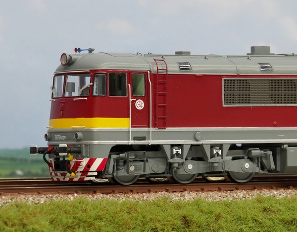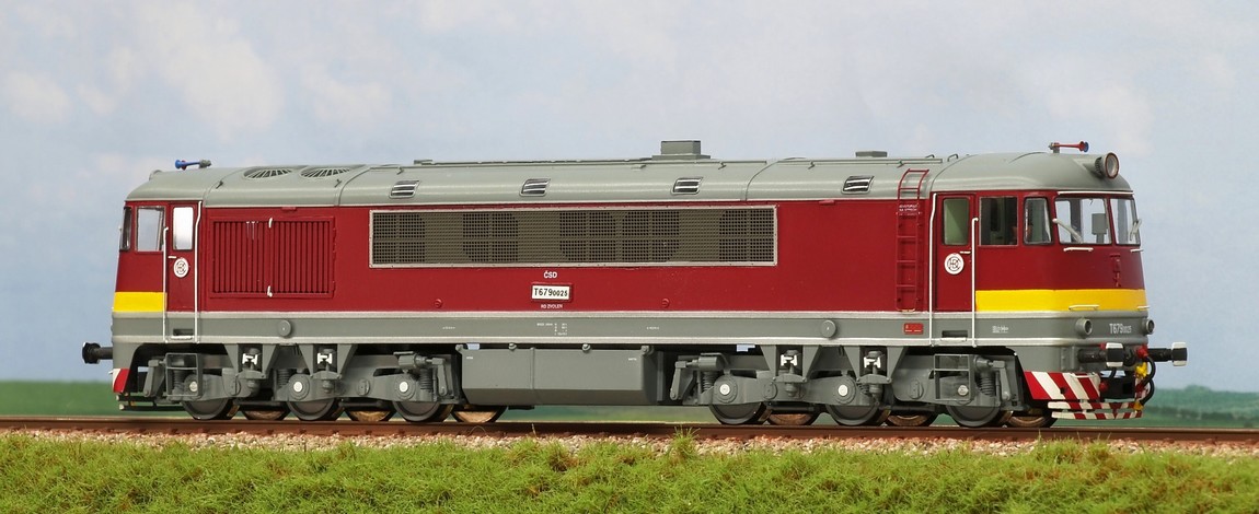 Dieselová šestinápravová lokomotiva T679 0025 se žlutým pruhem pod přezdívkou "pomeranč" nebo také "cénula" byla vyráběna v pražské ČKD v letech 1961 až 1965. Model z resinu z nové formy vyrobené 3D technologií na pojezdu Roco. Spousta leptaných doplňků, popisky na bázi tampoprintu. Číslo na boku lokomotivy je osvětleno Technické parametry: Osvětlení: ano bílá/červená dle směru jízdy DCC: ano Zvuk: ano Vybavení kabiny strojvůdce: ano Spřáhlo: normovaná šachta dle NEM