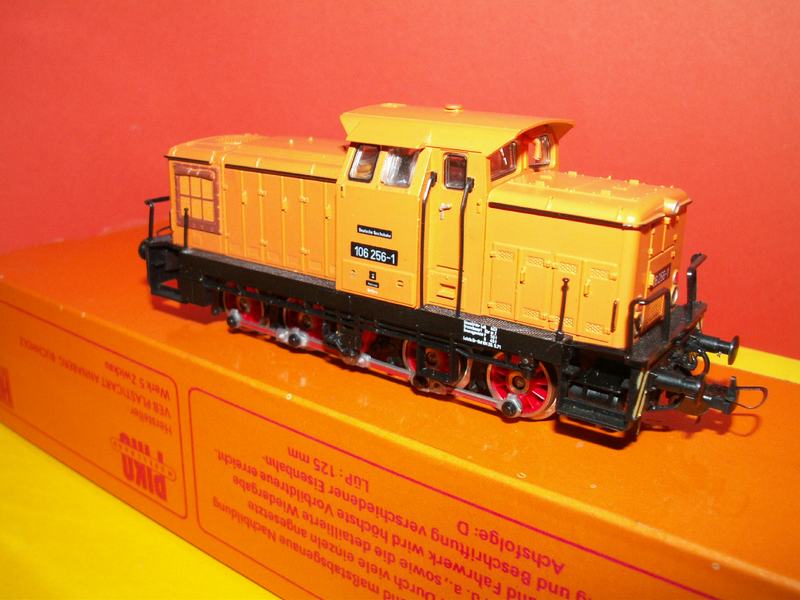 Dieselová lokomotiva řady BR 106 a to oranžové barvy drah DR. Model má naháněny všechny nápravy, osvětlení se přepíná dle směru jízdy, model má již nalepené doplňky je zcela v pořádku. Lokomotiva je uložena v krabičce. Výröbce:PIKO velikost HO