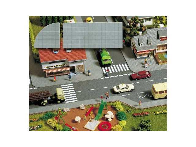 Dlažební deska Strukturovaná umělá hmota- dlažební deska pravoúhlý (14 kus, 49 x 21 x 2,2 mm) a zaokrouhlené tašky (4 kus, 21 x 21 x 2,2 mm). Jednoduchá adaptace na domy- a uliční průčelí.