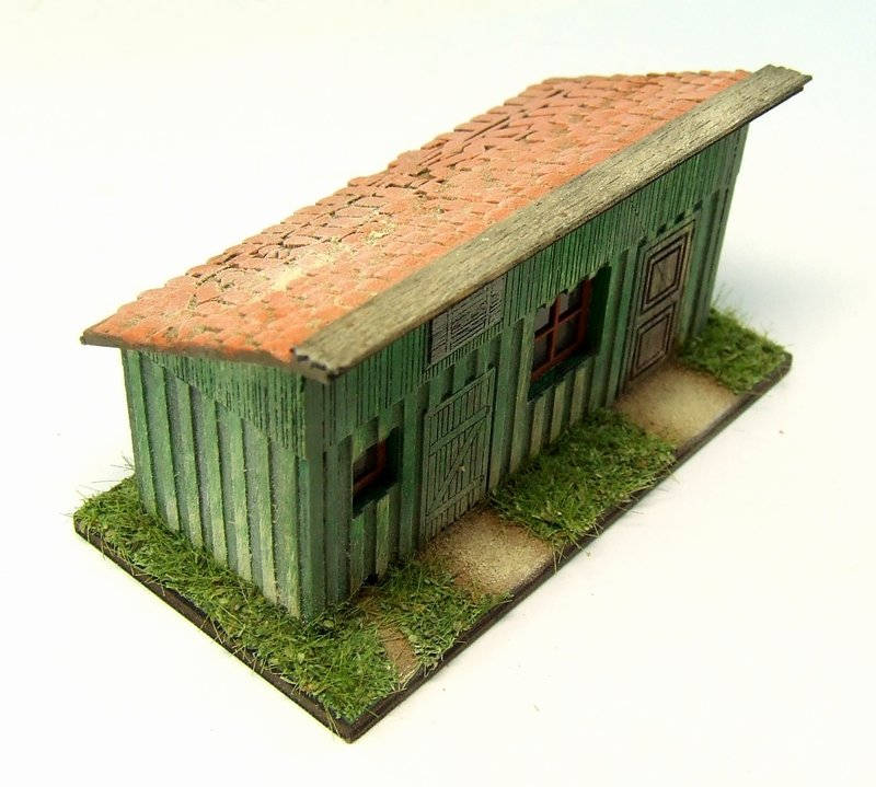 Sestavený model drážní kůlny je patinovaný a vyřezaný laserem.