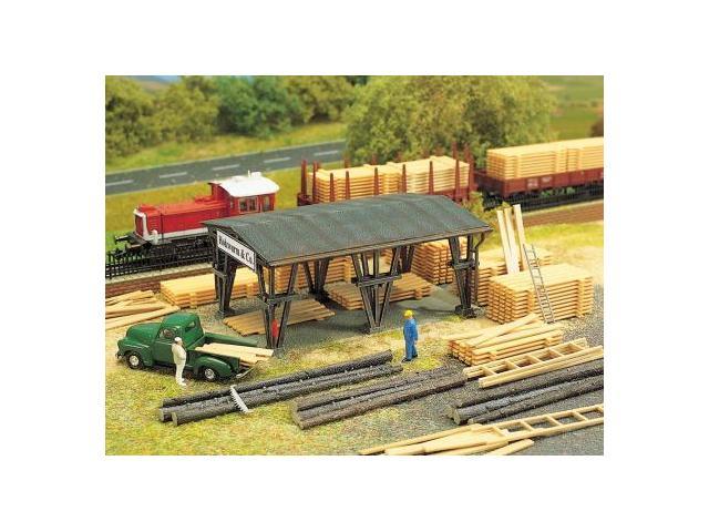 Dřevěný sklad Sklad jako otevřená kulna z kmenů stromů, klády, prkené konstrukce a hasicí přístroj...atd