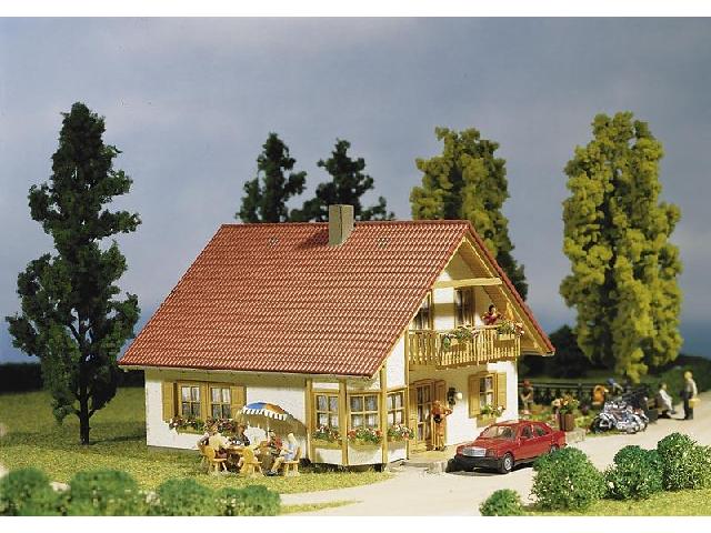 Dům Romantica s dřevěným balkonem. Dále střešní patro, přízemní vikýř, terasa a dřevěné okenice. Vhodné figurky č.150701-150703, 150901-150904, 151022, 151023, 151031, 151034. rozměry: 12,7x12,6x8,8cm