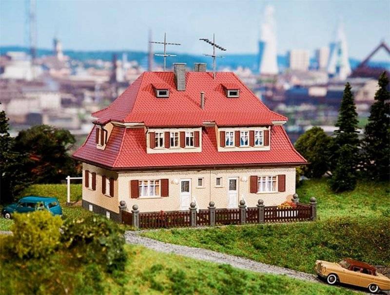 Stavebnice modelu dvojdomku s předzahrádkou s plotem. Rozměr: 145 x 140 x 110 mm