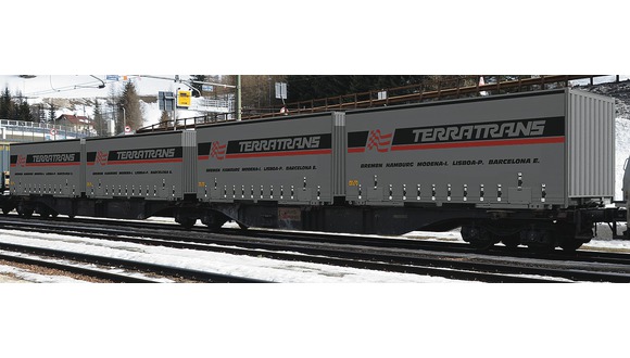 Dvojitý plošinový vůz s nákladem - firma Terratrans.