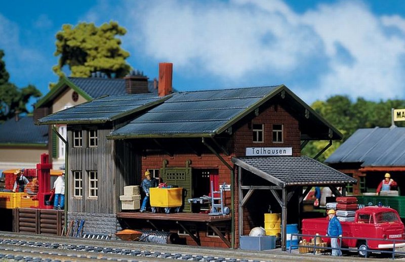 Stavebnice modelu nádražního skladiště s nakládací rampou a přístřeškem.
