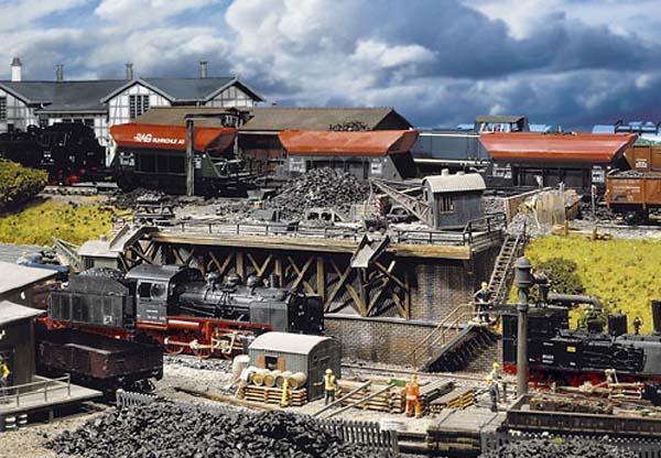 Neobyčejné zauhlovací zařízení. Vysoko položené nakládací koleje s důlními vozíčky, lze přímo sypat uhlí do tendru. Tento model lze libovolně sestavit. Rozněry: 36,0x16,6x14,5 cm Vhodné figurky č.151000, 151004, 151005.