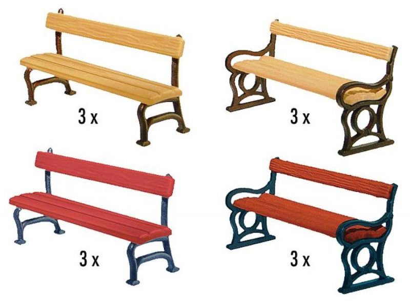 Sada obsahuje 12 ks různých parkových laviček, 4 druhy po třech kusech.