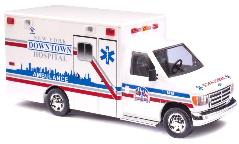 Model nemocniční dodávky zn. Ford E-350 ve sněhobílé barvě.