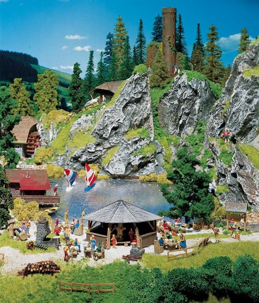 Sada obsahuje zastřešený grilovací přístřešek, stoly, lavice, stoličky a dřevěné kašny, otevřené ohniště s komínem atd. Rozměr: 78 x 54 x 48 mm