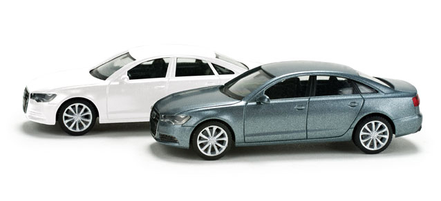 Hotový model Audi A6 ® sedan v bílé barvě. Měřítko: 1:87