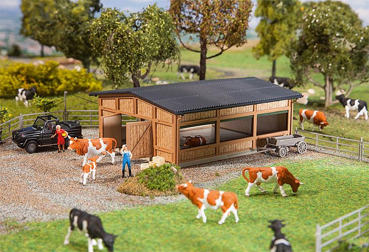 Laser-cut stavebnice moderního prostorného přístřešku pro zemědělská zvířata. (Rámová konstrukce, střecha a plot obklopující přístřešek jsou vyrobeny z plastu.) Rozměr: 115 x 98 x 45 mm Celková délka plotu: ca. 500 mm