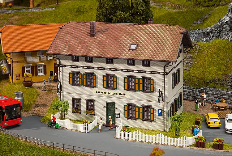 Patinovaná stavebnice venkovského hostince s barevnými okenicemi, truhlíky na květiny a dalšími doplňky. Rozměr: 200 x 121 x 155 mm