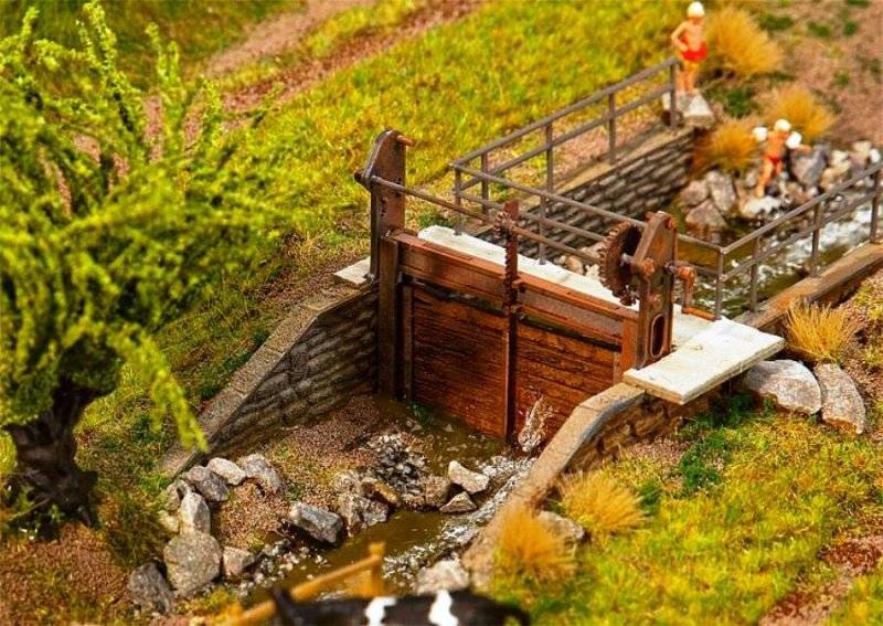 Stavebnice dvou hrází. Vrata, zábradlí a zdivo jako kombinace laserového řezání a lisovaných materiálů. Rozměr: 120 x 60 x 50 mm, 60 x 30 x 12 mm