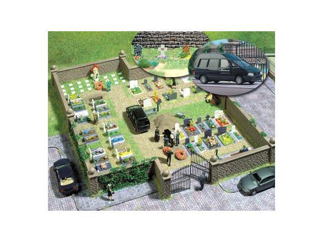 V balení zeď (80cm), sloupky, železné brány, 40 hrobů, pohřební vůz (Renaut Espace), rakev, kříž, pumpa, lavice, věnce hromada písku, kárka a nářadí