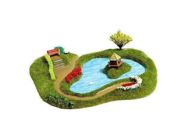 Jezero s ostrovem S domečkem pro labutě, 1x labuť a lavička... viz obrázek. Velikost: asi 23 x 18 cm.