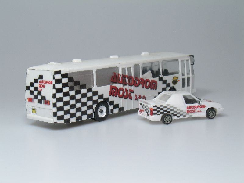 Přepravník závodních aut Autodrom Most. Model obsahuje Karosu C-734, Škodu pick-up freestyle a obtisky.