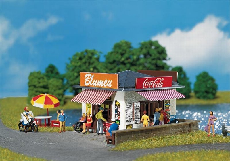 Model kiosku s bohatým dekoračním příslušenstvím.