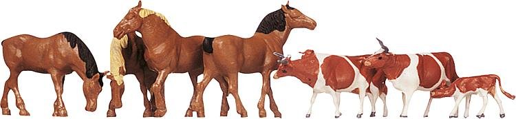Sada obsahuje figurky koní a hnědých strakatých krav.