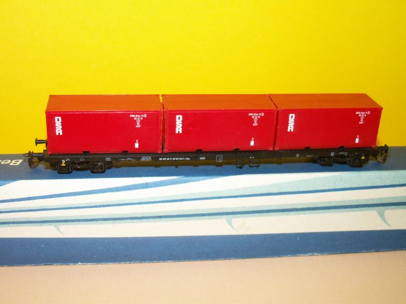 4 osý kontejnerový vůz červenéí barvy pod názvem DSR, kontejnery lze sejmout model má krabičku a je v naprostém pořádku má i doplnky jako jsou klanice a další.. Vůz v tomto provedení se již nevyrábí. Výrobce:Tillig stav:nové