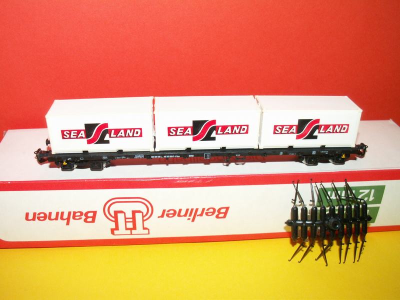 Kontejnerový vůz to 4 osý s nápisem ,,SEA LAND" drah německých, model má doplňky např. klanice a další, má krabičku. Stav:nové