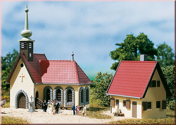 Venkovský model kostel a fara. Hostel se zvonicí. Rozměry: 100x82x115mm 92x59x60mm