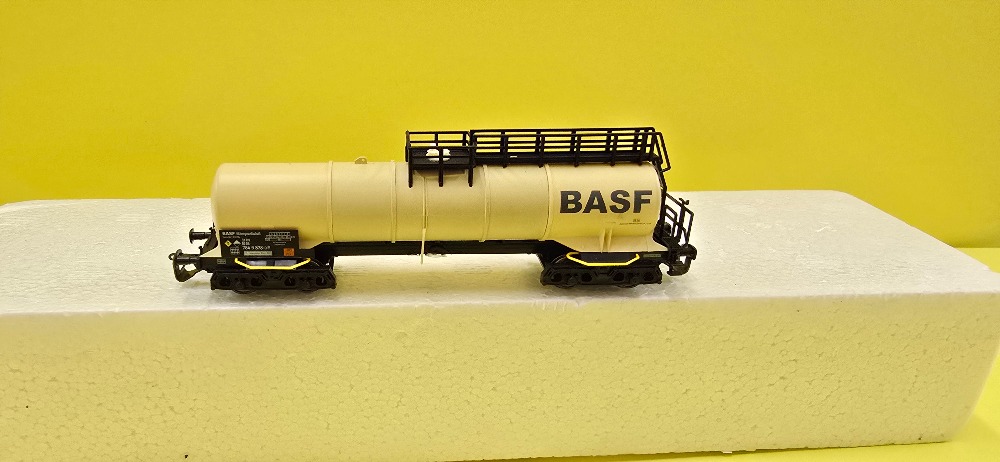 Kotlový 4 nápravový nákladní vůz s nápisem"BASF" drah DB AG, délka:120mm, kinetické krátké spřáhlo.