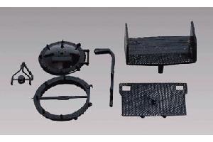 Sklápěcí dveře kouřové komory, táhlo řízení, stupačka a potrubí.