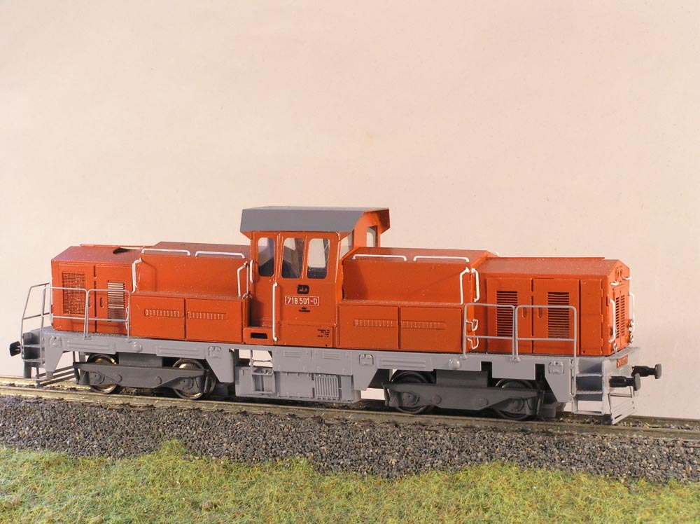 Maketa dieselové lokomotivy řady 718 501-0. Balení obsahuje ( karoserii s rámem v barvě, jako na obrázku i s popisy, masky podvozku, nádrž, nárazníky a drobné doplňky). Neobsahuje (motor, převody, podvozky, osvětlení, kola).
